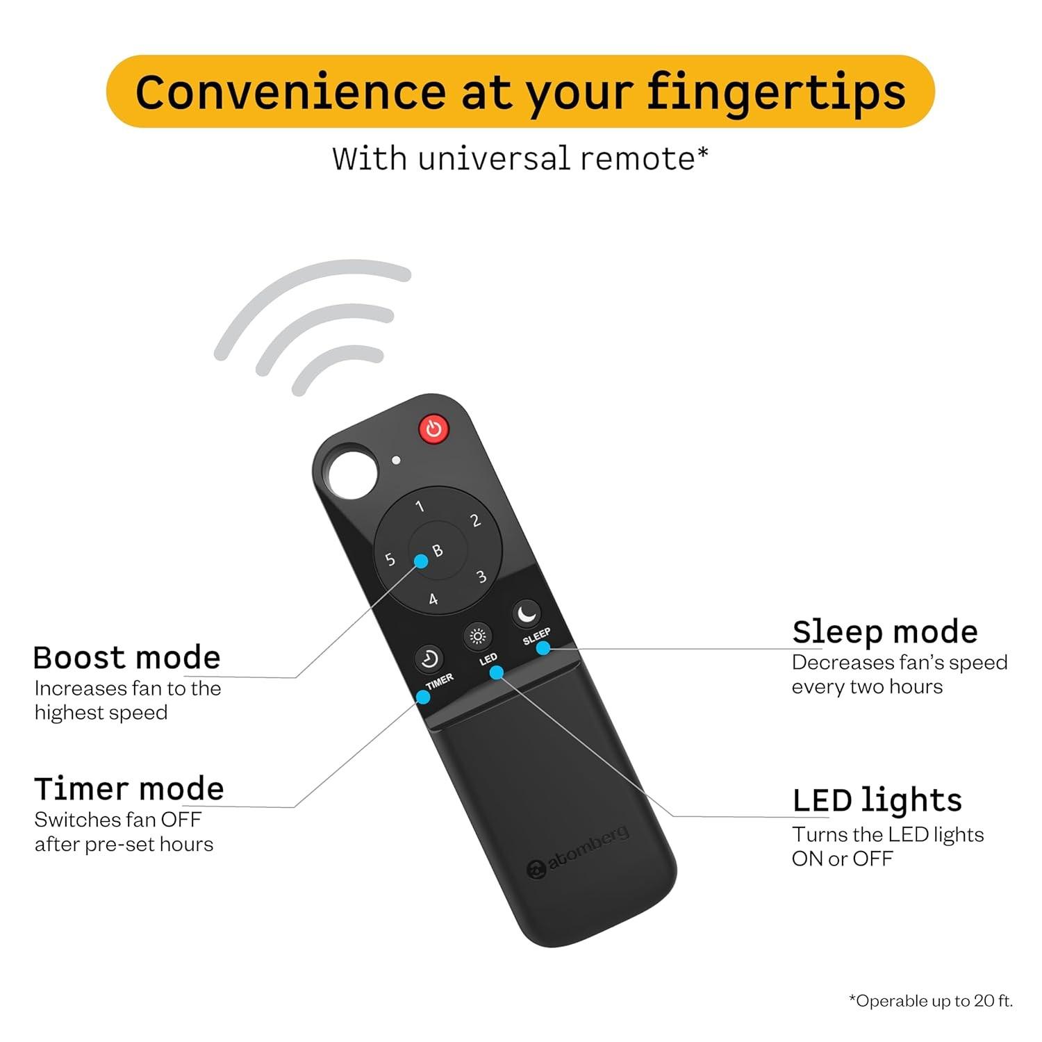 ADDED CONVENIENCE OF REMOTE: Atomberg Aris Starlight fans come with a Smart IR Remote. IR remotes are easy to use without the hassle of pairing. Adjust the fan's speed or activate its unique features like boost mode, timer, or sleep mode at the click of a button.