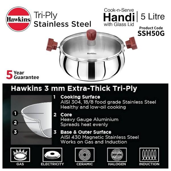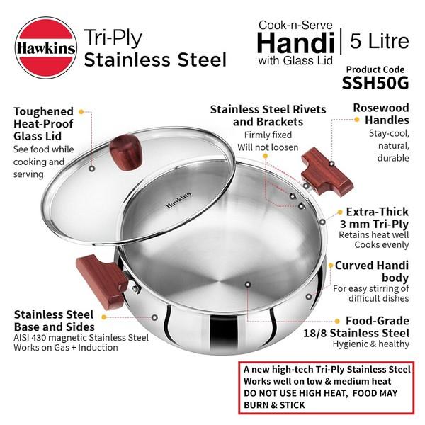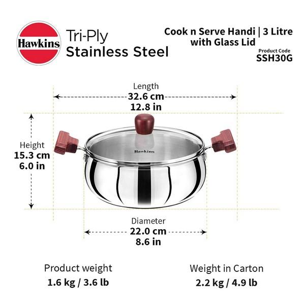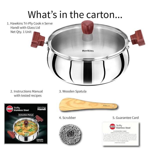 Hawkins Tri-ply Stainless Steel Cook n Serve Handi is designed to give you all the advantages of cooking in stainless steel while minimizing the disadvantages of sticking and burning that are normally associated with ordinary stainless steel. The cooking surface (inner surface) is made from 18/8 food-grade (AISI 304) stainless steel which is extremely hygienic, most durable, does not react with most foods and does not pit or corrode. The heavy gauge aluminium core spreads heat well for even cooking with no hot spots, and retains heat for quick cooking. It is sandwiched between two layers of stainless steel and does not come in contact with food on the cooking surface. The base (outer surface) is made of AISI 430 grade magnetic stainless steel. Hence this cookware can be used on all domestic gas, induction, electric, ceramic and halogen cooktops. The unique curved body of the Cook-n-Serve Handi is most suitable for stir-frying, sautéing and foods that require considerable stirring, and makes light work of difficult dishes too! The toughened, thick Glass Lid is made of heat-resistant glass with a strong stainless steel rim and stay-cool knob. It stops splatter of hot foods. The snug-fit glass lid locks in the steam, heat and flavours.