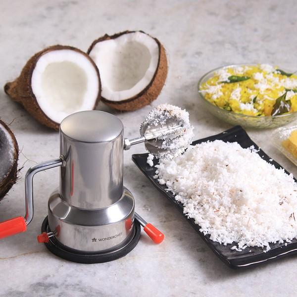 HIGH-QUALITY CONSTRUCTION: Wonderchef coconut scraper is constructed using stainless steel, ensuring its longevity and resistance to wear and tear. ERGONOMICALLY DESIGNED HANDLE: The scraper is designed with user comfort in mind. The scraper comes with a rotatable handle with a comfortable grip, allowing for easy and efficient scraping of coconuts without straining your hands or wrists. SHARP BLADES: The scraper is equipped with sharp and sturdy blades specifically designed for scraping coconuts. These blades effectively remove the coconut meat from the shell, ensuring clean and precise scraping. COMPACT AND PORTABLE: The scraper is compact and lightweight, making it easy to store and transport. Its portable design allows you to use it anywhere, whether in the kitchen or even during outdoor activities like picnics or camping. EASY TO USE: The scraper is straightforward to use, requiring manual effort to scrape the coconut. Simply hold the coconut against the blades and rotate the handle, allowing the sharp blades to remove the meat from the shell. EASY TO CLEAN: The scraper is designed with ease of cleaning in mind. After use, you can easily detach the blades for thorough cleaning and maintenance. It is important to clean the scraper after each use to prevent any residue from accumulating. TRADITIONAL AND AUTHENTIC: The manual coconut scraper offers a traditional and authentic way of scraping coconuts, allowing you to experience the process in its original form. This can be appealing to individuals who prefer a more hands-on approach to food preparation.