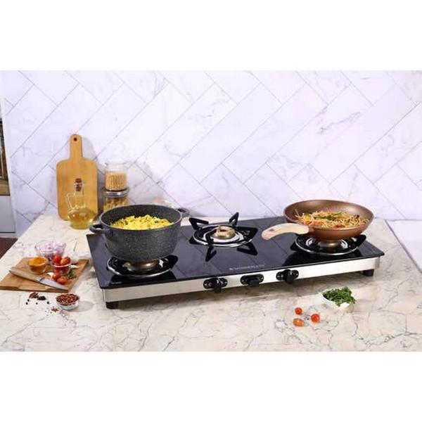 LARGE TRI-PIN BRASS BURNERS: The burners are made of high-quality brass, and designed with a tri-pin configuration, offering efficient heat distribution and uniform cooking.