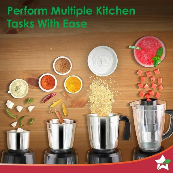 - One Machine, Many Possibilities: The Galaxy Mixer Grinder has four jars of varying capacities and super sharp stainless steel blades, perfect for dry grinding, wet grinding, chutney making, juicing, and blending. All-In-One Solution: Be it chutneys, masalas, batters, purees, pastes, podis, milkshakes, or smoothies, the Galaxy mixer grinder handles even the toughest ingredients with ease.