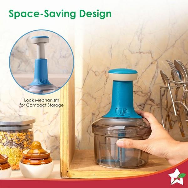 Chop vegetables, nuts, and other hard ingredients with ease. Surgical grade blades at different heights for perfect dicing and chopping. Control the size of the pieces with the number of pushes. Firm antislip grip, unique locking mechanism.