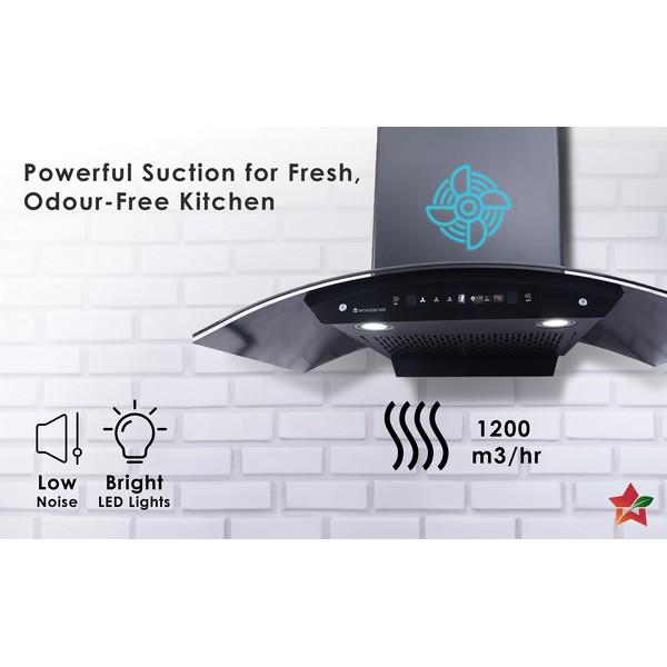 Classy and efficient low noise chimneys, with LED lights, powerful suction capacity of 1400 M 3 / h , gesture and touch control for speed and power, LED light, tempered glass, auto-clean technology.